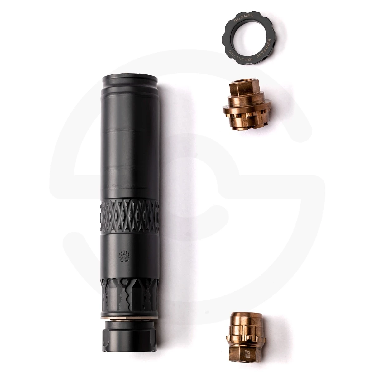 The Rugged Alaskan 360 is a versatile, lightweight, and modular multi-caliber suppressor designed for rifles, pistols, and subguns. It handles calibers ranging from 9mm up to .338 Lapua. It is constructed from 17-4 stainless steel and Grade 5 titanium, making it durable for full-auto use while remaining suitable for backcountry hunting